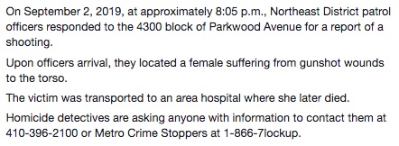 "On September 2, 2019, at approximately 8:05pm, Northeast District patrol officers responded to the 4300 block of Parkwood Avenue for a report of a shooting," said Baltimore Police in a statement on Facebook.