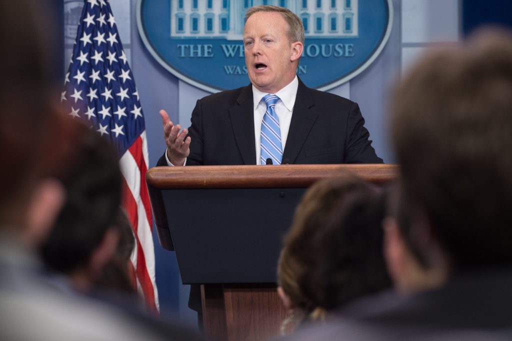 Sean Spicer speaks during the daily press briefing at the White House in Washington, DC, 2017. (NICHOLAS KAMM/AFP/Getty Images)[/caption]