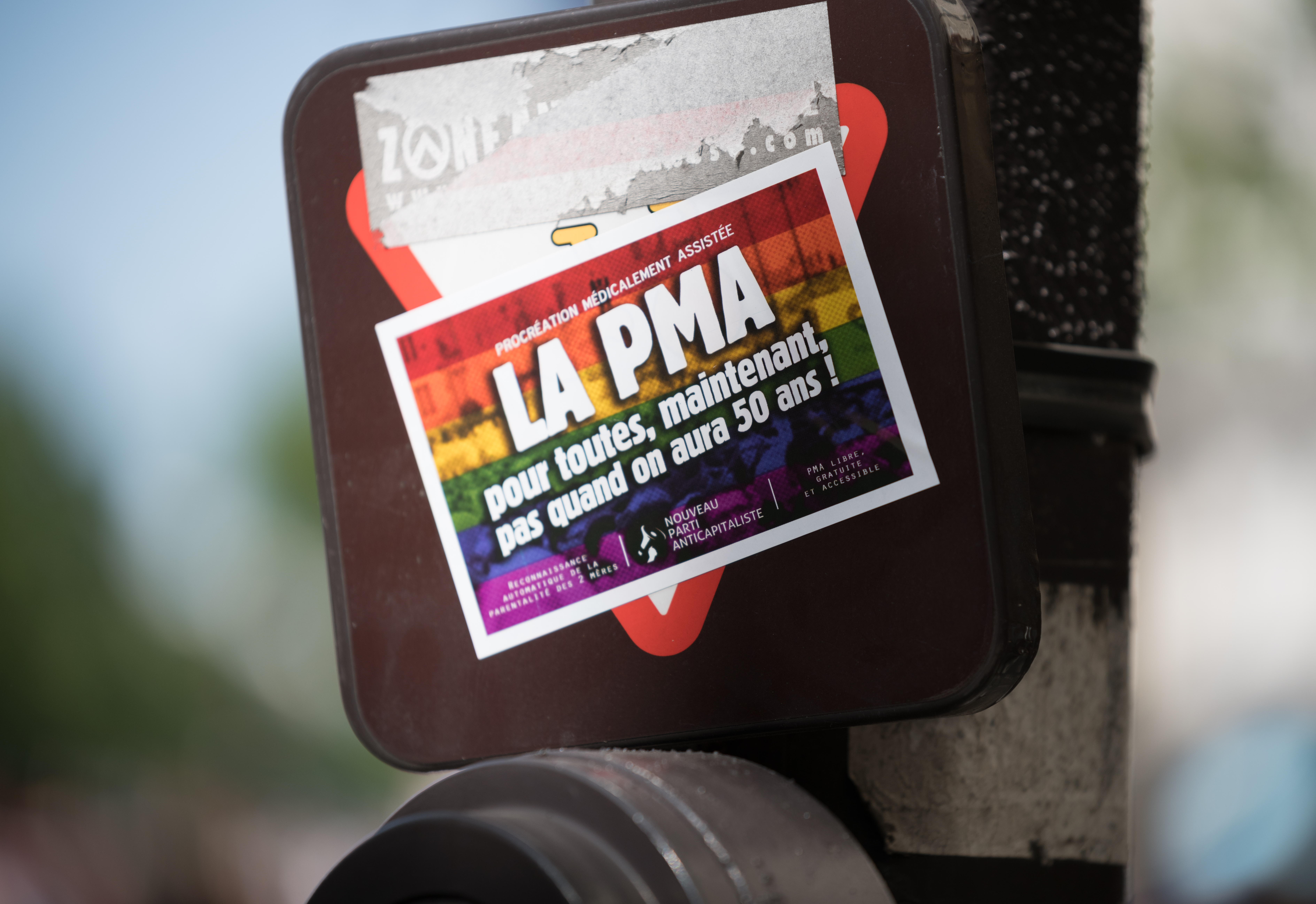 Sticker referring to Medically Assisted Procreation (PMA) during the LGBT+ Pride March 2019 in Paris. (Estelle Ruiz/NurPhoto via Getty Images)[/caption]