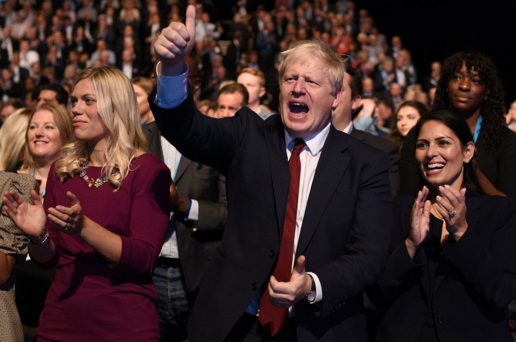 Boris Johnson applauds Sajid Javid's keynote speech at the annual Conservative Party conference on September 30, 2019 (Oli Scarff/AFP/Getty)[/caption]