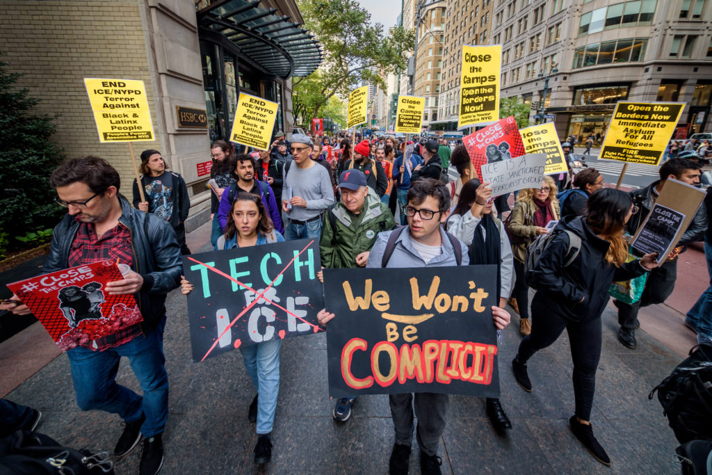 Hundreds of activists and immigration advocates took to the streets in New York City to demand an end to Salesforce and Amazon profiteering from immigrants detention camps (Erik McGregor/LightRocket/Getty)