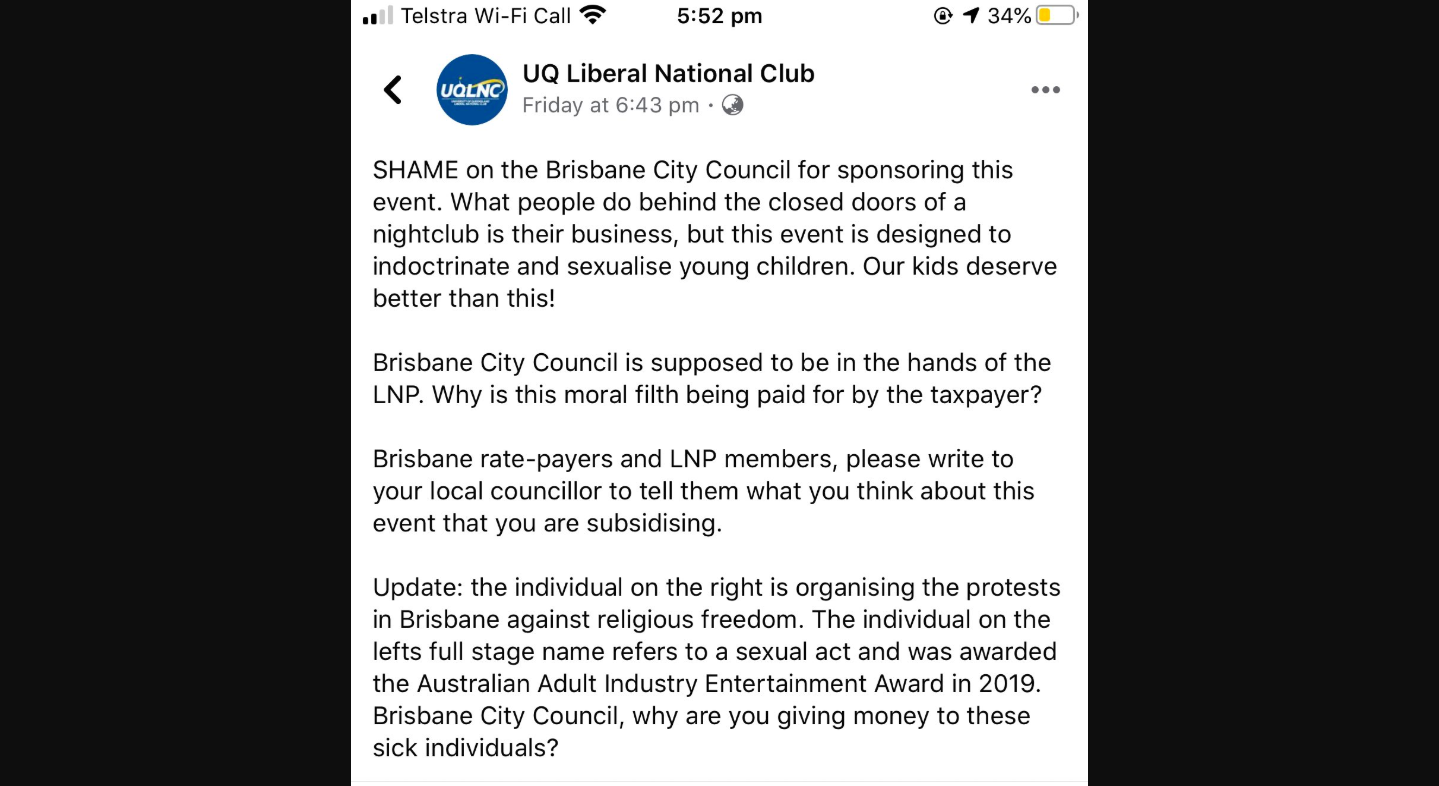 But UQ Liberal National Club views such events as "moral filth," condemning the drag queens as "sick individuals" in a statement posted to Facebook.