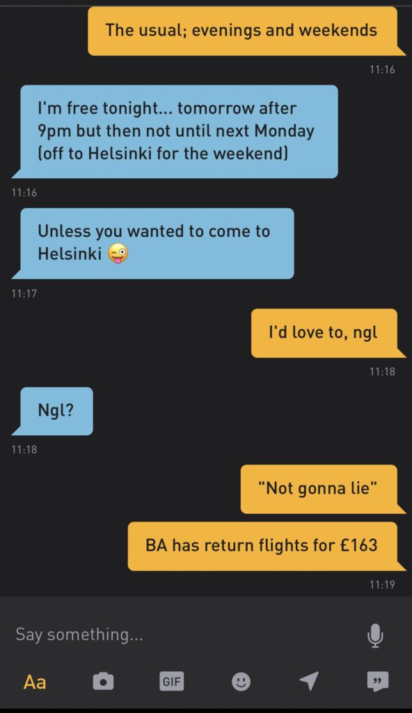 "He told me that he lives in West London and was free to meet tonight, or after he gets back from his weekend away in Helsinki and jokingly said: 'Unless you wanted to come to Helsinki?'