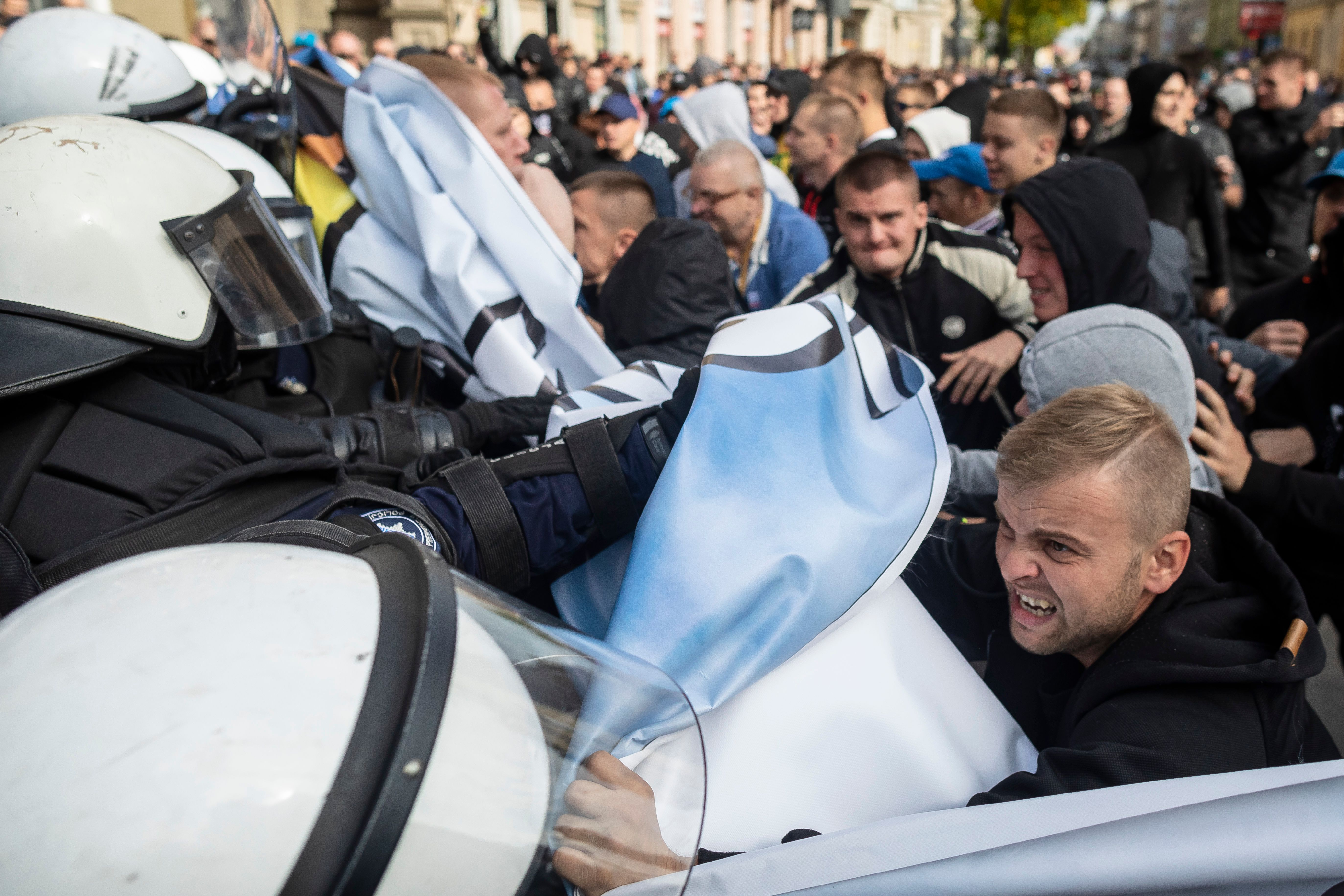 Far-right extremists clash with riot police at the march in Lubin last year (WOJTEK RADWANSKI/AFP/Getty)[/caption]