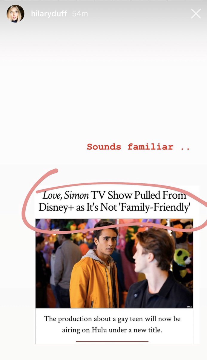 The 32-year-old Lizzie McGuire star shared a news headline about this controversy, which read: "Love, Simon TV show pulled from Disney+ as it's not 'family friendly'."