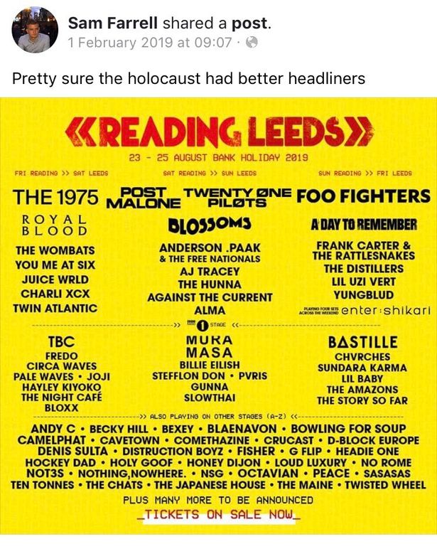 The Union of Jewish Students (UJS) circulated Farrell's social media posts online, and shared another in which commented on the line-up for Reading festival, writing: "Pretty sure the holocaust had better headliners."