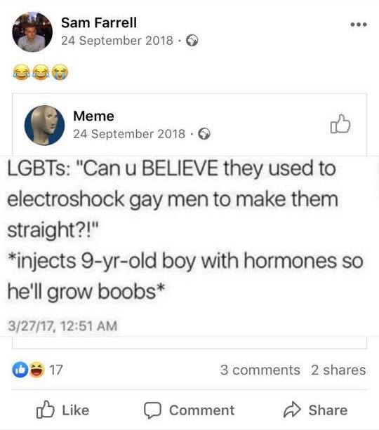 Further screenshots posted by Edge Hill University students reportedly show Farrell mocking the LGBT+ community, trans kids and Muslims.