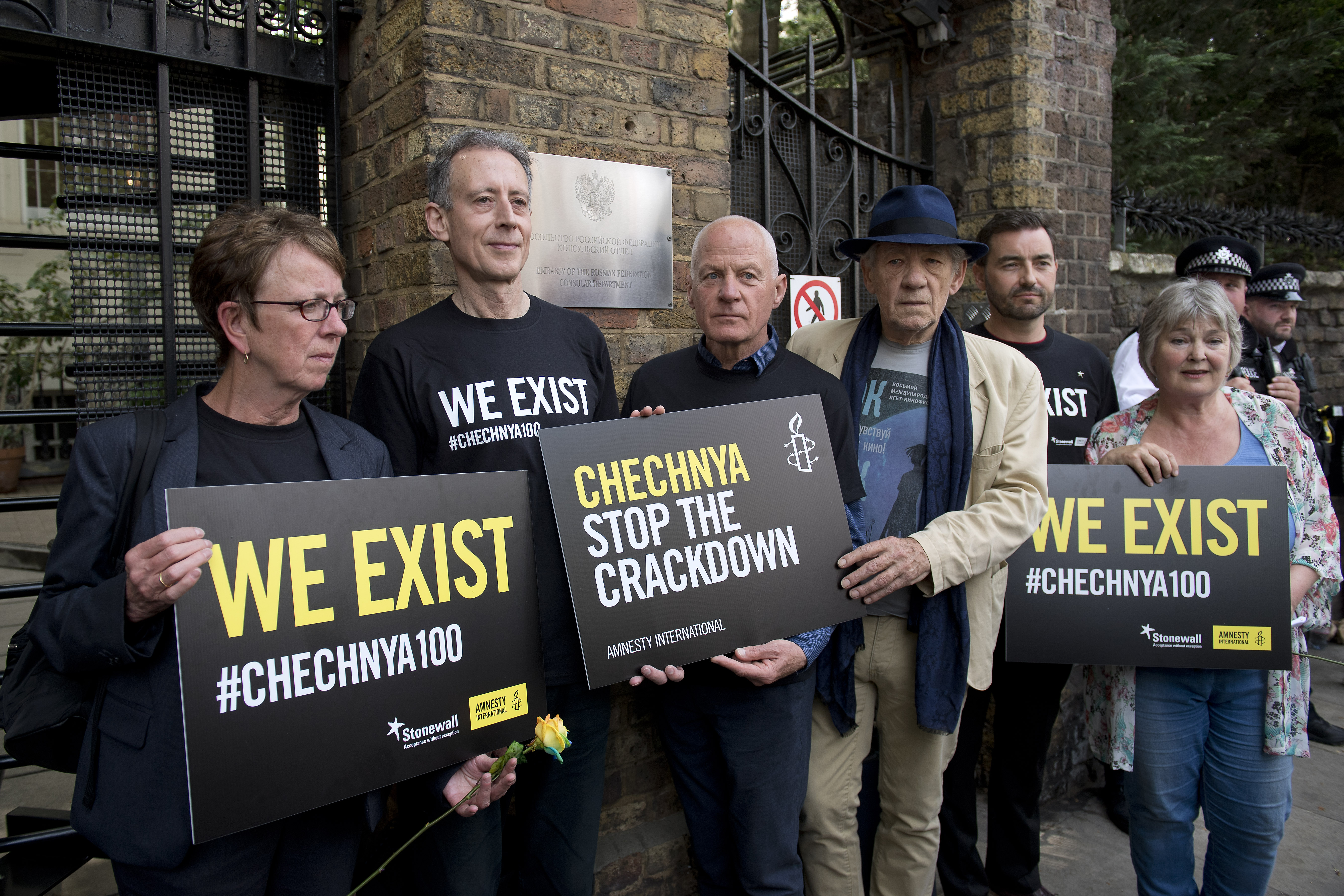 Activist Peter Tatchell and actors Michael Cashman and Ian McKellen protesting Chechnya's alleged 'gay purge' outside the Russian Embassy in 2017. (Justin Tallis/AFP/Getty)[/caption]