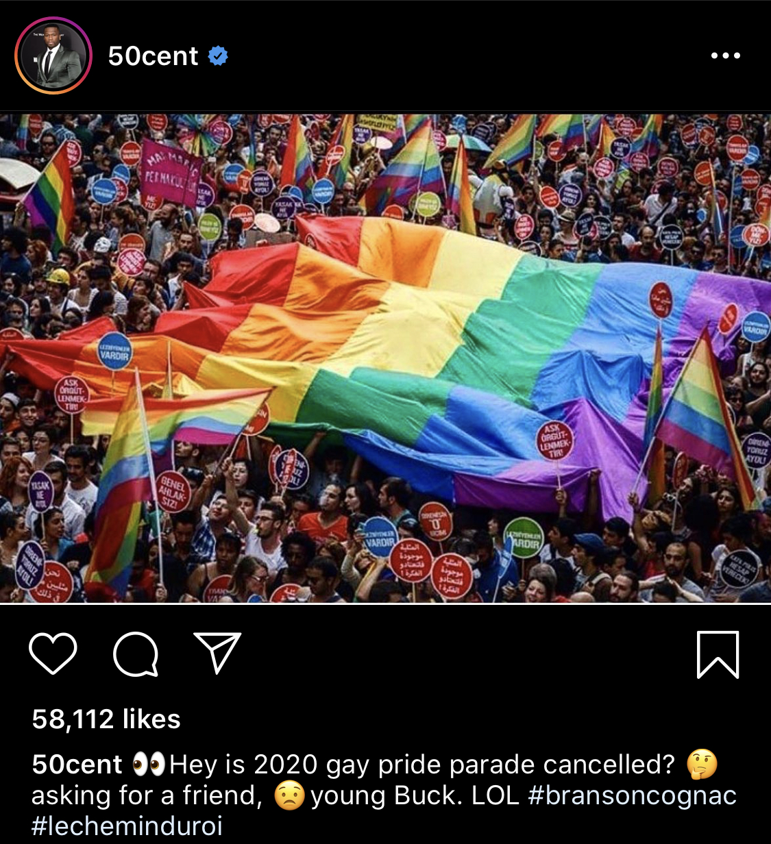 Sharing a photo of a Pride parade, he wrote: "?Hey is 2020 gay pride parade cancelled? ?asking for a friend, ?young Buck. LOL."