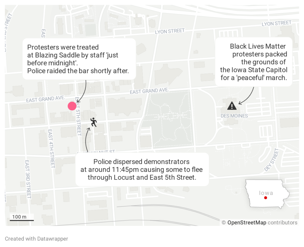 An LGBT+ bar in Des Moines, Iowa, was "violently raided" by police after club organisers gave medical assistance to Black Lives Matter protesters.