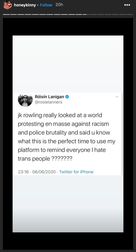 One was a screen capture of a tweet by i-D junior editor Róisín Laingan that read : "JK Rowling really look at a world protesting en masse against racism and police brutality and said: 'You know what, this is the perfect time to use my platform to remind everyone I hate trans people?'"