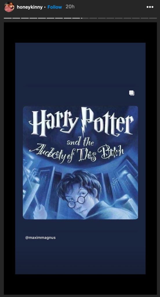 Honey also posted on Instagram an edited version of the front cover of Harry Potter and the Order of the Phoenix, retitled: "Harry Potter and the Audacity of This B***h."