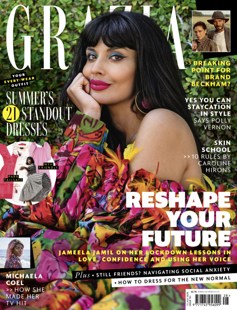 Jameela Jamil on the cover of Grazia, on sale Tuesday June 30. (Grazia/Josh Stadlen following social distancing guidelines)[/caption]