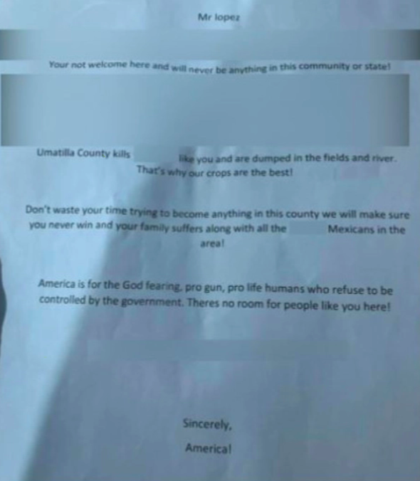 Jonathan Lopez, 29, recently lost his race for a commissioner seat in Umatilla County, Oregon. He said he found the hateful letter in his mailbox on June 23, after the election.