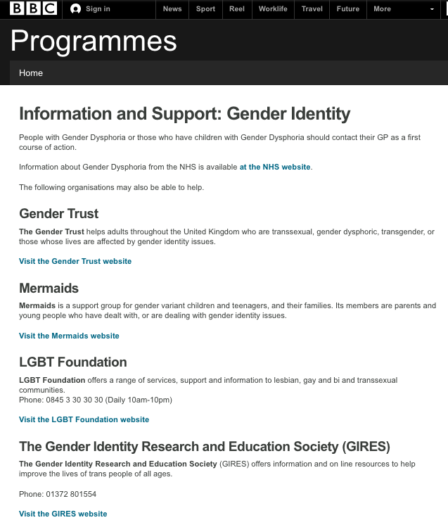 The page on the BBC website called "Information and Support: Gender Identity" used to begin by advising people with gender dysphoria to visit their GP.