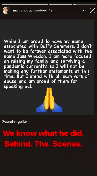 Michelle Trachtenberg, who played Buffy's pugnacious sister Dawn, shared Gellar's statement in an Instagram story, adding: "We know what he did. Behind. The. Scenes."