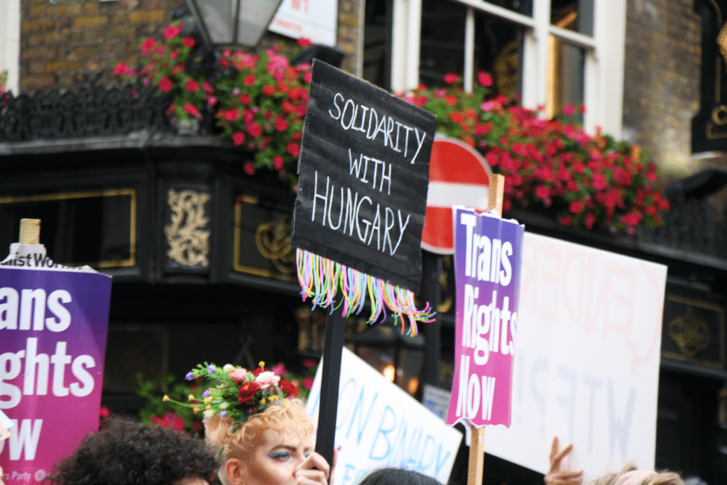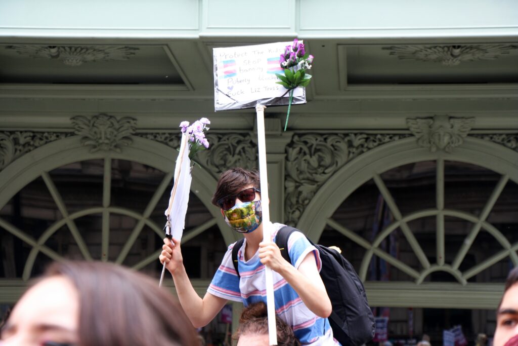 There were reminders that Black Trans Lives Matter , proud proclamations of dykes for trans rights, and angry messages directed at Boris Johnson and his Tory colleagues – "Protect the kids, stop banning puberty blockers, f**k Liz Truss," read one.