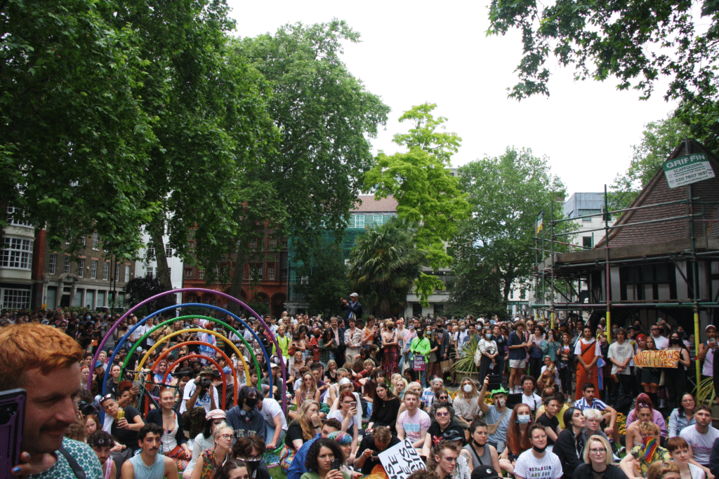After a detour down some narrower streets to avoid Piccadilly itself, which was being blocked by an anti-mask protest, protestors arrived in Soho and made their way to Soho Square. Volunteers handed out bottles of water, snacks, masks and hand sanitiser.
