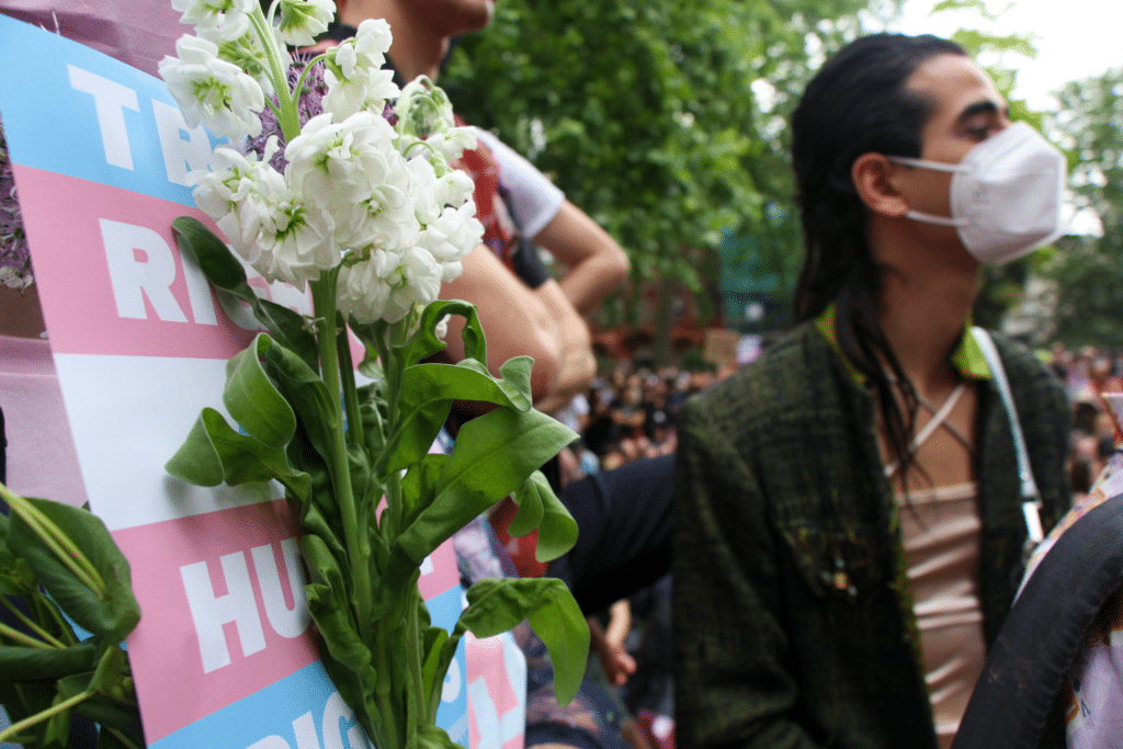 Trans and non-binary people sat on the grass, surrounded by allies and joy. The energy was victorious. Tired trans kids drooped onto parents shoulders. Flowers and placards were threaded into the park's railings.