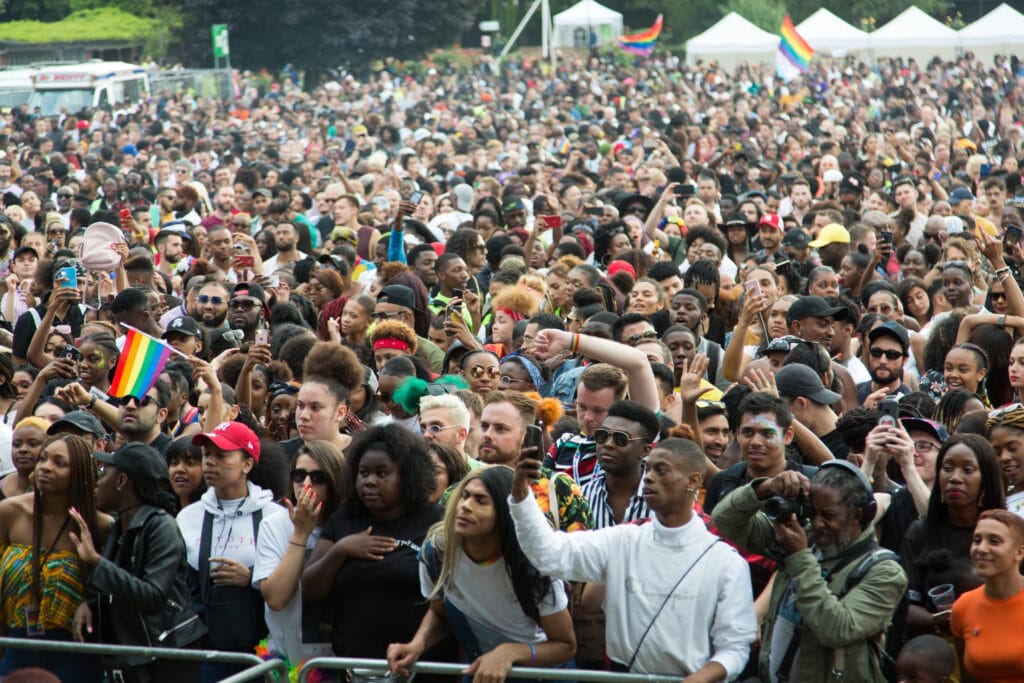 People gathering at the UK Black Pride in Haggerston Park in London, 2019. (Quintina Valero/Getty Images)[/caption]