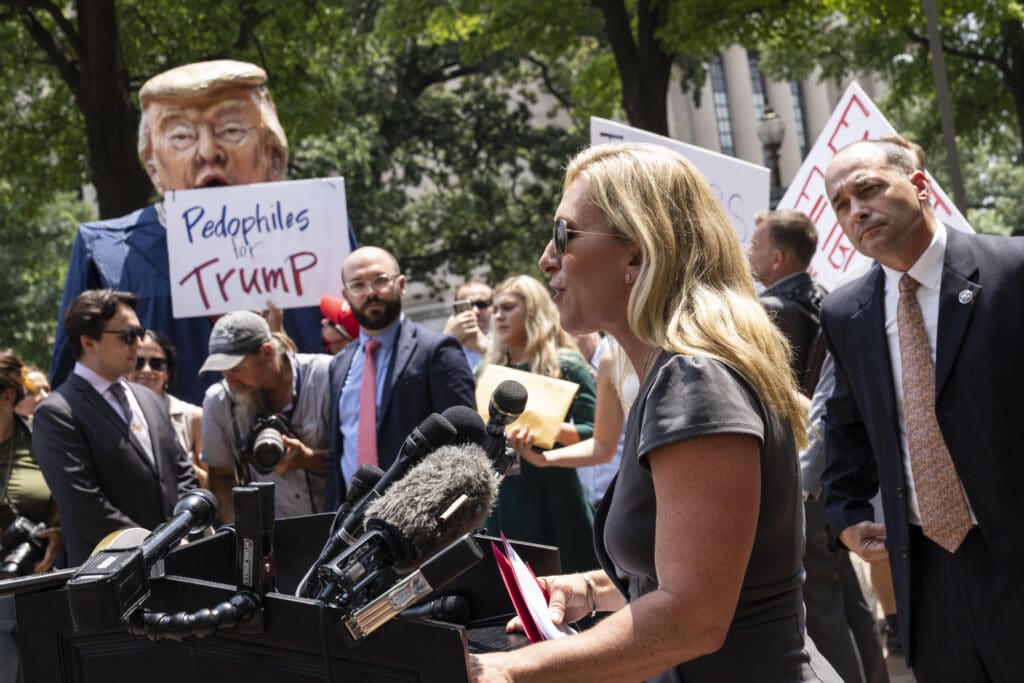 Protestors hold an effigy of former president Donald Trump Marjorie Taylor Greene speaks. (Drew Angerer/Getty Images)[/caption]