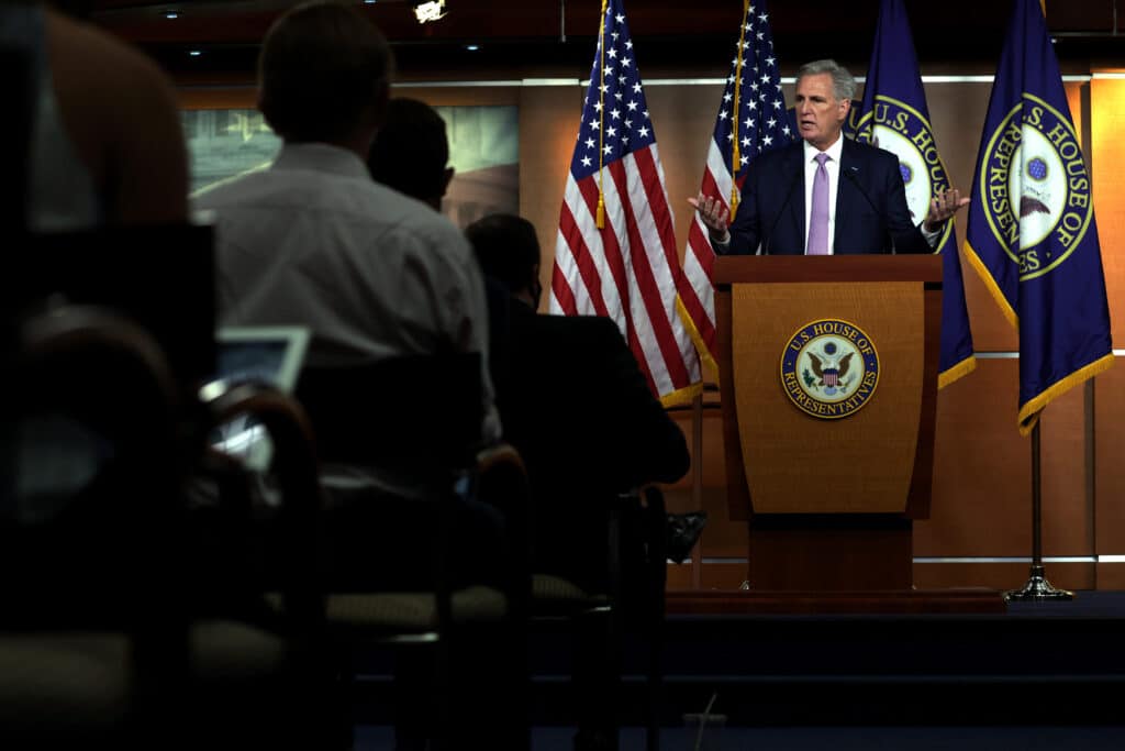 Kevin McCarthy speaks during a weekly news conference. (Alex Wong/Getty Images)[/caption]