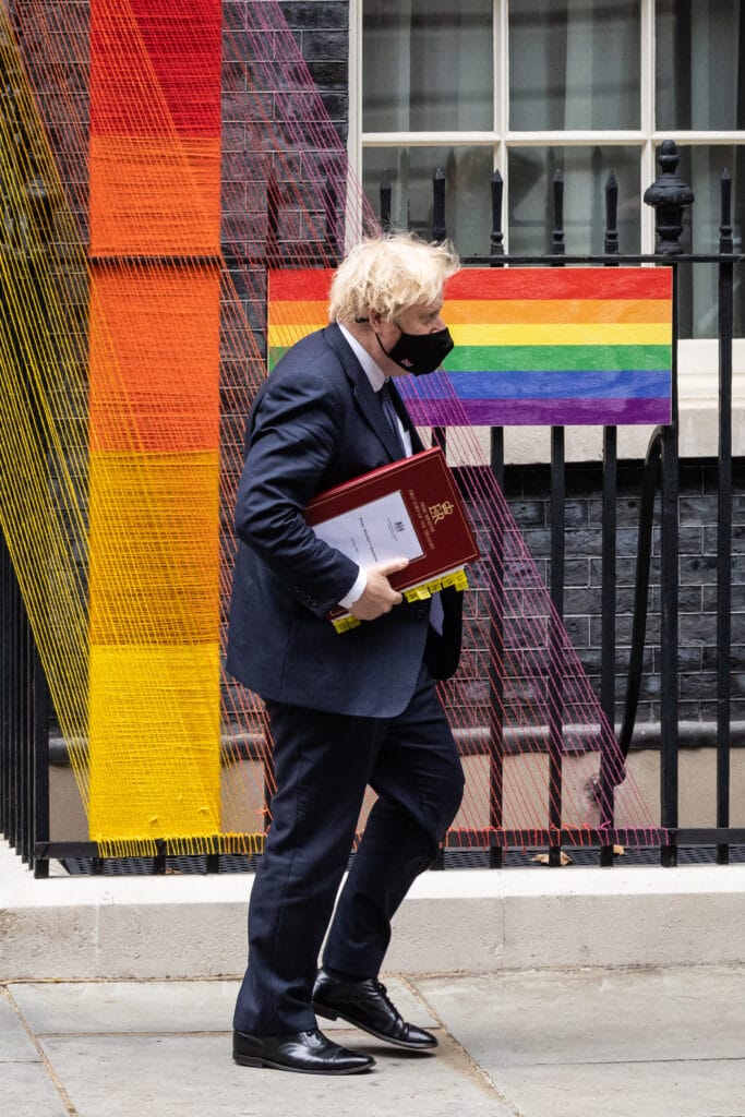 LONDON, ENGLAND - JUNE 30: Britain's Prime Minister Boris Johnson walks beneath the Pride Month installation outside number 10, as he heads to the weekly PMQ session in the House of Commons, at Downing Street on June 30, 2021 in London, England. (Photo by Leon Neal/Getty Images)[/caption]