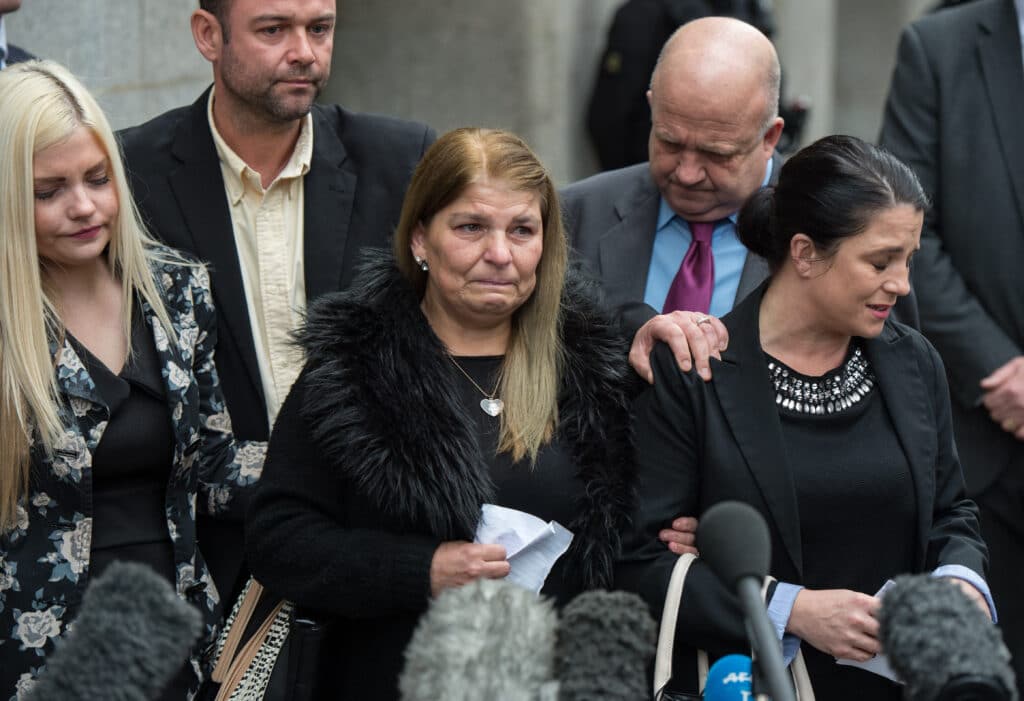 Mum Jeanett Taylor (C) and Donna Taylor (R), of victim Jack Taylor speak to the media after a guilty verdict was found against Stephen Port. (Chris J Ratcliffe/Getty Images)[/caption]
