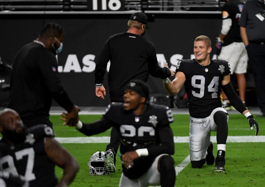 Carl Nassib #94 of the Las Vegas Raiders is greeted by head coach Jon Gruden. (Ethan Miller/Getty Images)[/caption]
