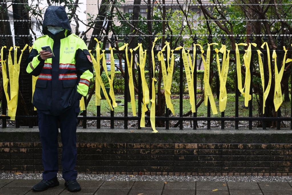 During the protest on Monday (14 February), LGBT+ activists tied yellow ribbons around the gates the Executive Yuan building. The names and nationalities of couples who have been seperated were written on the ribbons, as well as the length of time they have been seperated for.