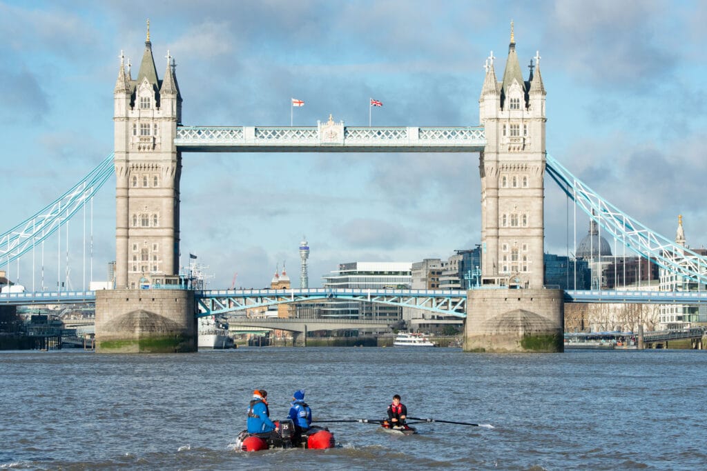 Tom Daley rows along the Rover Thames through Tower Bridge (Comic Relief/Todd-White Art Photography/Getty Images)[/caption]