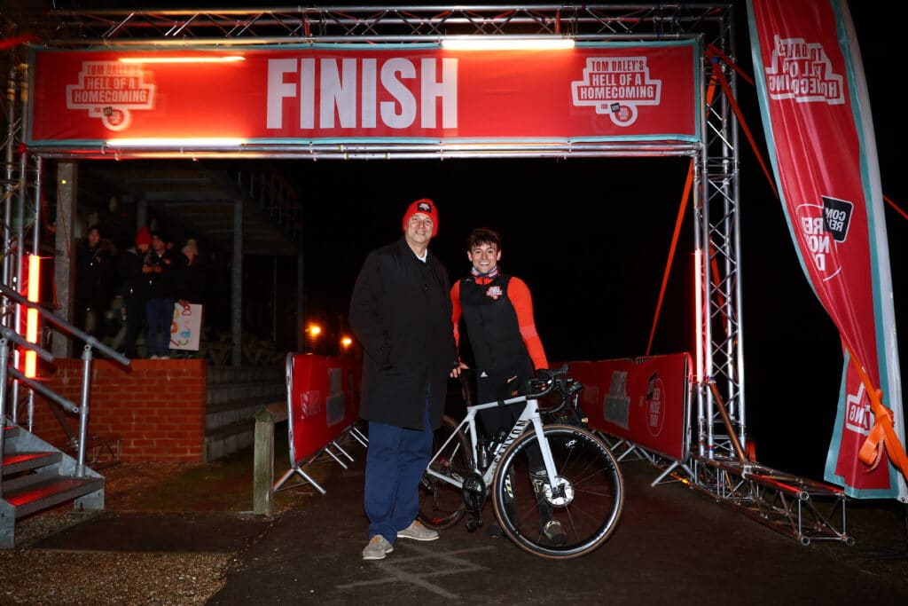 Tom Daley finishes his cycle leg and arrives to meet Steve Redgrave in Reading on day one of his Comic Relief challenge (Jordan Mansfield/Comic Relief via Getty Images)[/caption]