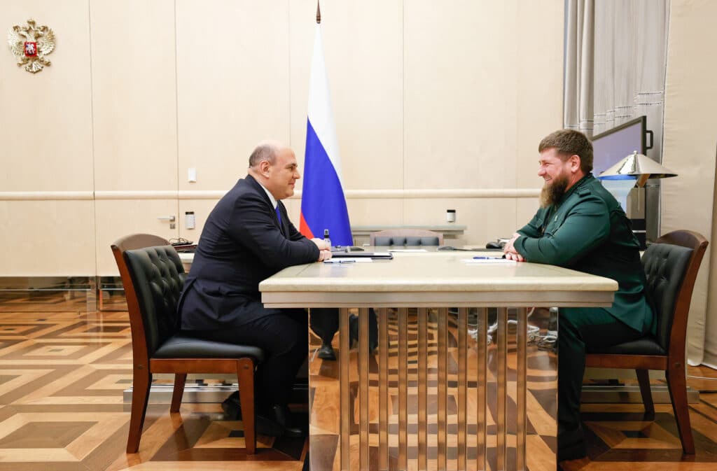 Russia's Prime Minister Mikhail Mishustin (L) and Ramzan Kadyrov, head of the Chechen Republic, during a meeting. (Dmitry AstakhovTASS via Getty Images)[/caption]