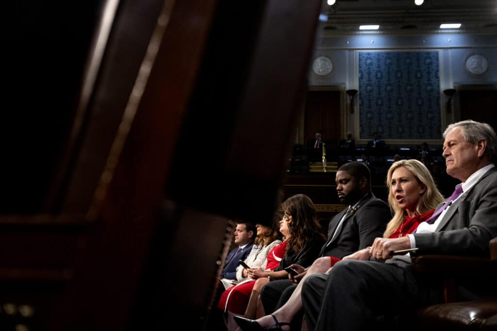 Marjorie Taylor-Greene reacts as Joe Biden delivers the State of the Union address. (Saul Loeb - Pool/Getty Images)[/caption]