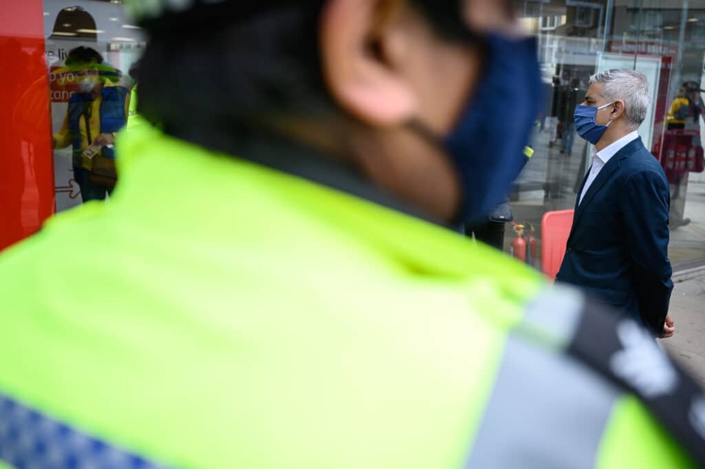 London Mayor Sadiq Khan (R) speaks to police officers as he walks through Ilford shopping precinct. (Leon Neal/Getty Images)[/caption]