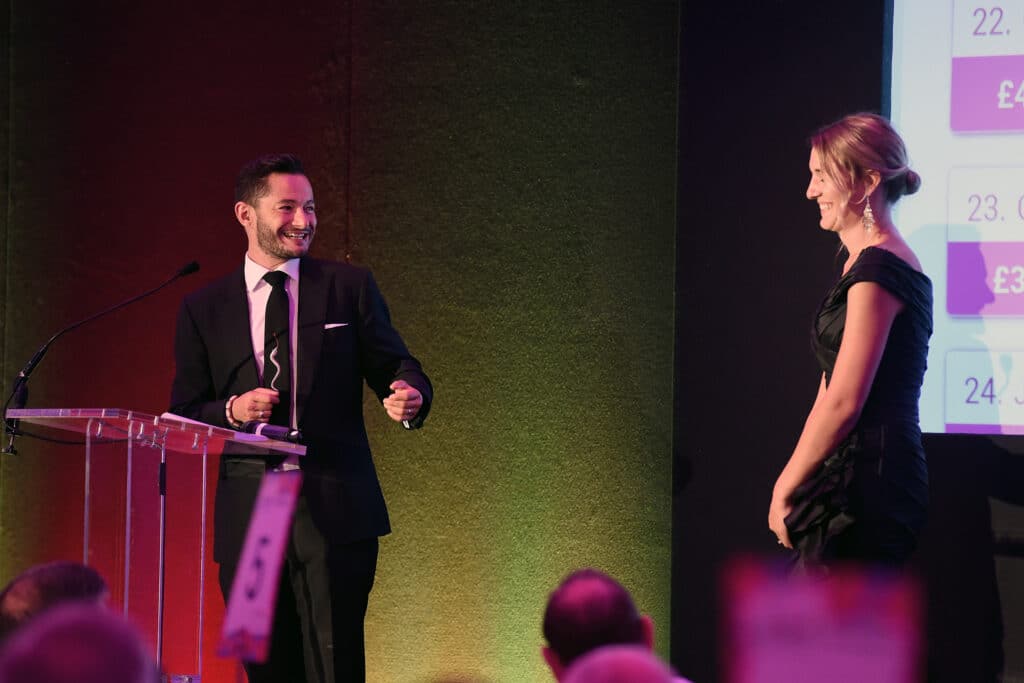 Jake Graf (L) and Hannah speak onstage at the Pride In London Gala Dinner 2018. (Antony Jones/Getty Images)[/caption]