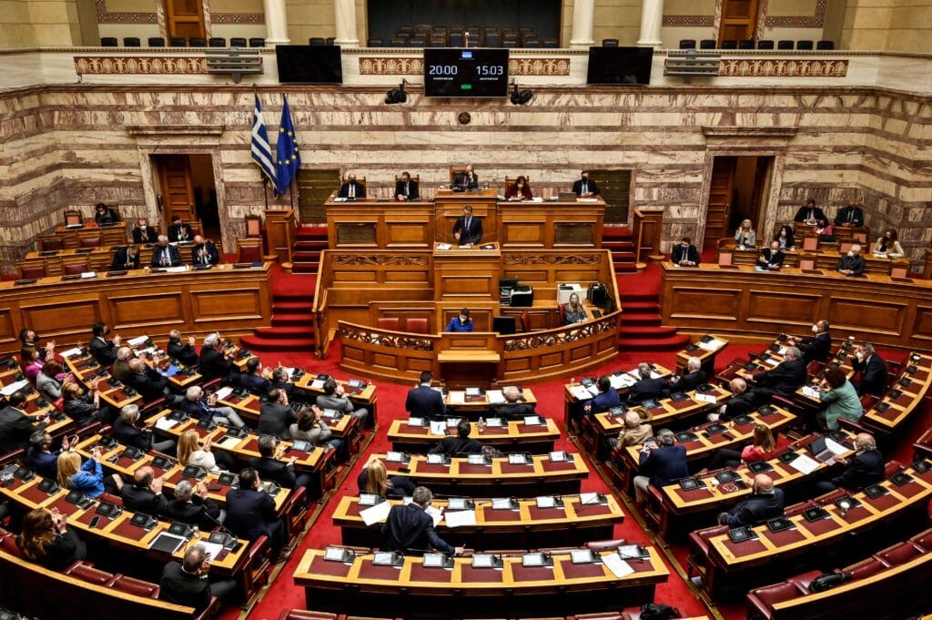 Greek prime minister Kyriakos Mitsotakis addresses the Greek Parliament on 12 May 2022. (LOUISA GOULIAMAKI/AFP via Getty Images)[/caption]