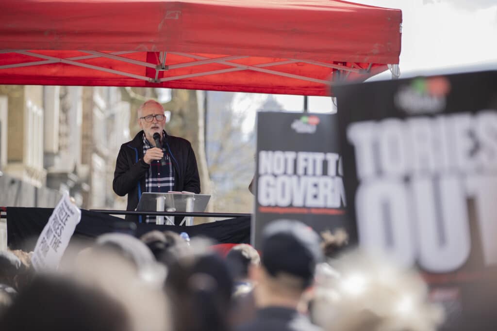 Former Labor Party leader Jeremy Corbyn at a demonstration outside prime minister Boris Johnson's residence. (Photo by Rasid Necati Aslim/Anadolu Agency via Getty Images)[/caption]
