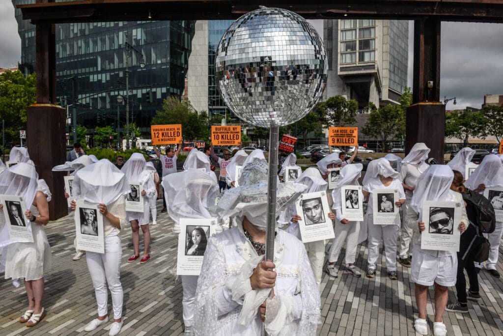 Wearing white veils, demonstrators gathered around a disco ball while holding signs bearing the faces of those fatally shot in Pulse, as well as others killed in other mass shootings.