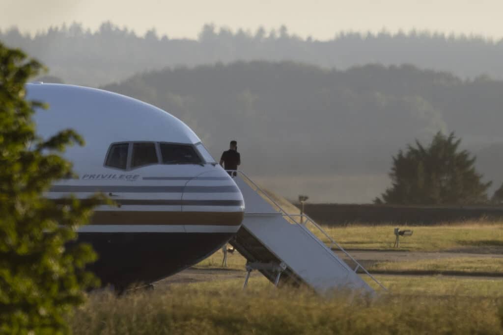 The EC-LZO Boeing 767 was set to fly seven men from Britain to Rwanda – only for a last-minute ruling to ground it. (Dan Kitwood/Getty Images)[/caption]