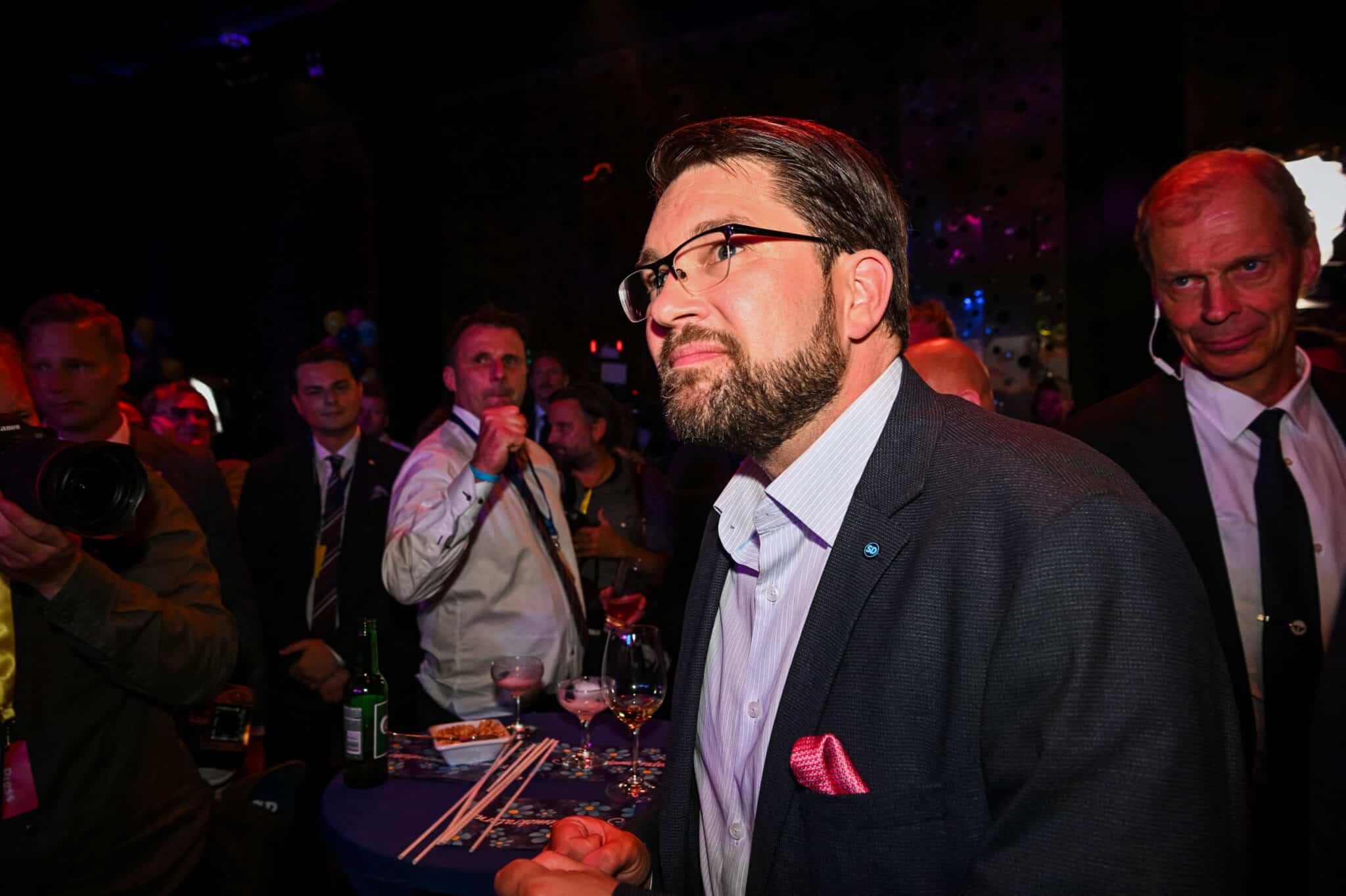 The leader of the Sweden Democrats Jimmie Akesson celebrates at the party's election watch in Nacka, near Stockholm late Sunday evening on September 11, 2022. (Jonathan Nackstrand/ Getty)Sweden Democrats emerged from the neo-Nazi movement in the mid-1990s.