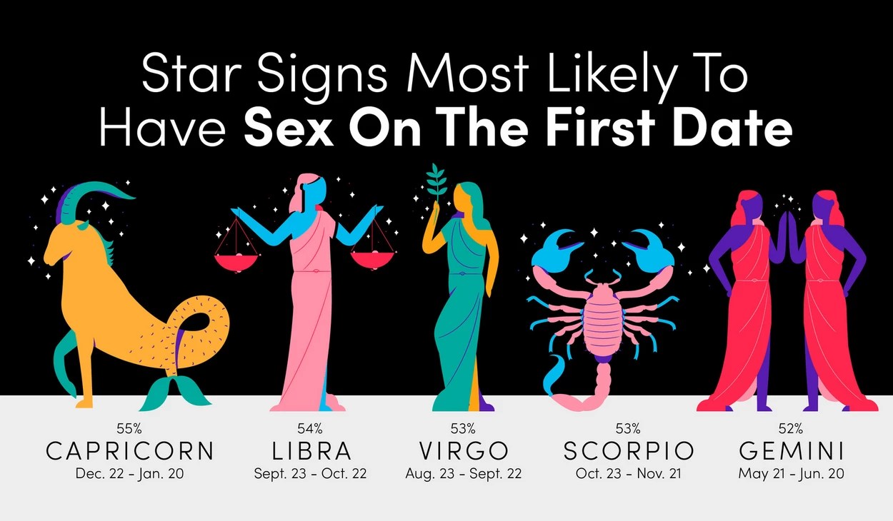 And if you're a star sign enthusiast, they also found that Capricorns (55 percent) and Libras (54 percent) came out on top when it comes to first date sex.