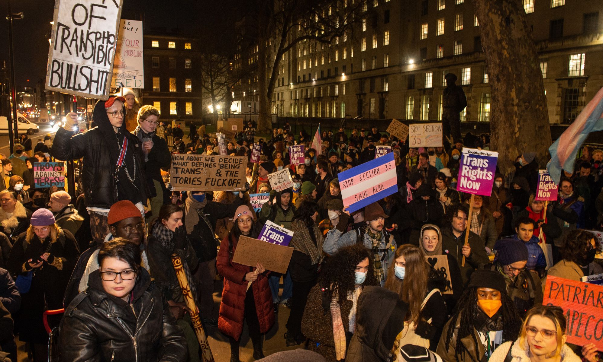 Independent media group What The Trans estimated that at least 500 protestors joined the impromptu march at 10 Downing Street, waving colourful signs calling on the UK government to reconsider its decision.