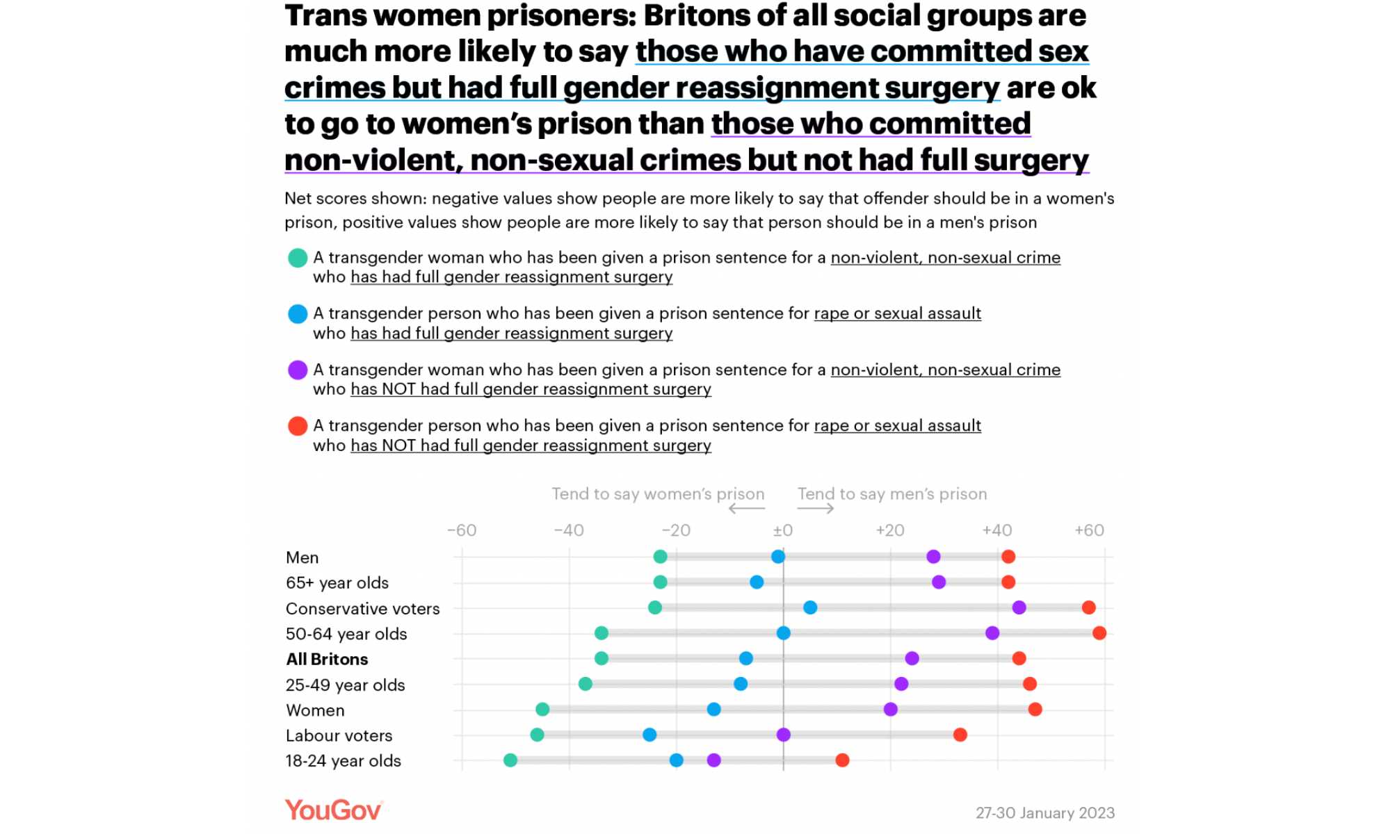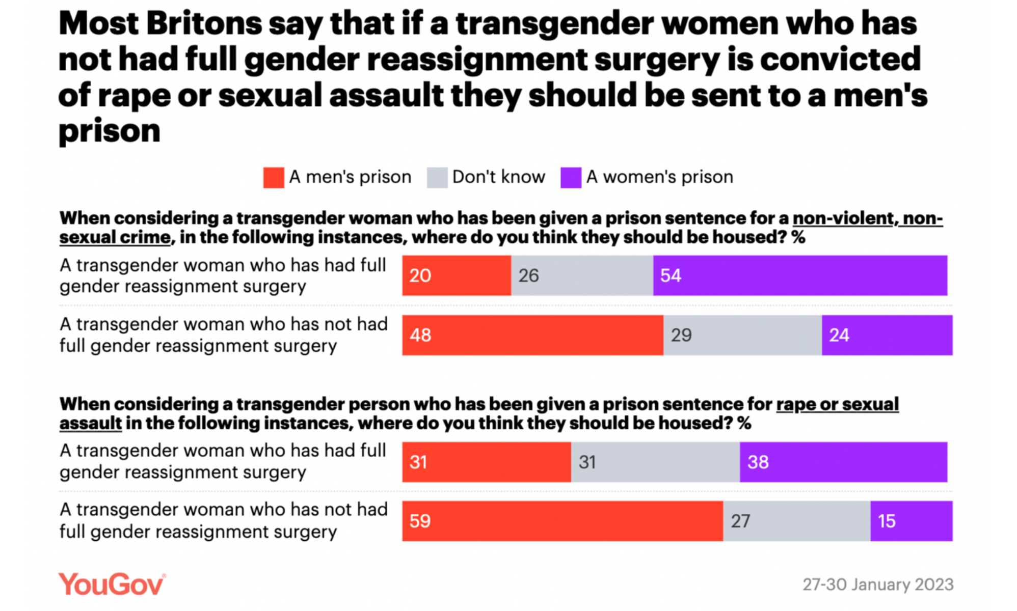The YouGov poll found Women's and men’s views are largely identical: 57 per cent of men and 61 per cent of women say a trans woman who has not had "full" gender affirming surgery and has committed a rape or sexual assault should go to a men’s prison, with only 14 to 15 per cent saying they should go to a women’s prison.