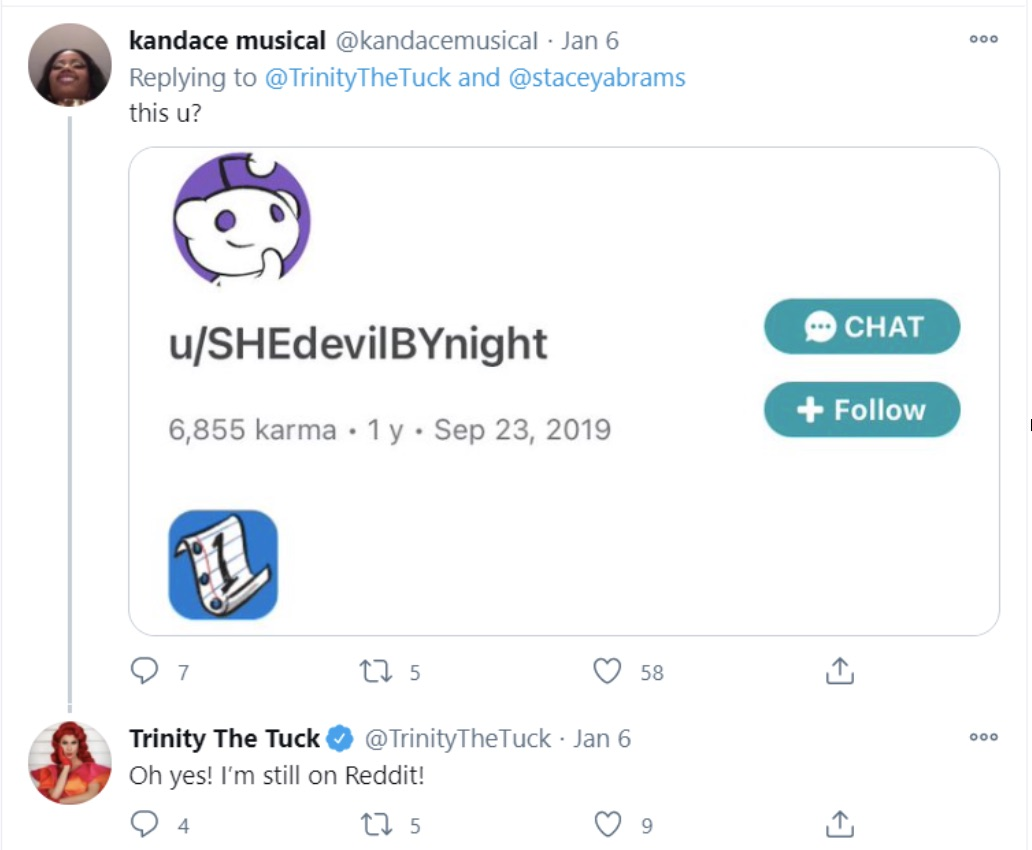 Trinity has never addressed the origins of the SheDevilByNight account, which has posted various questionable takes, including defending RuPaul against accusations of transphobic behaviour and a whole lot of thirst.