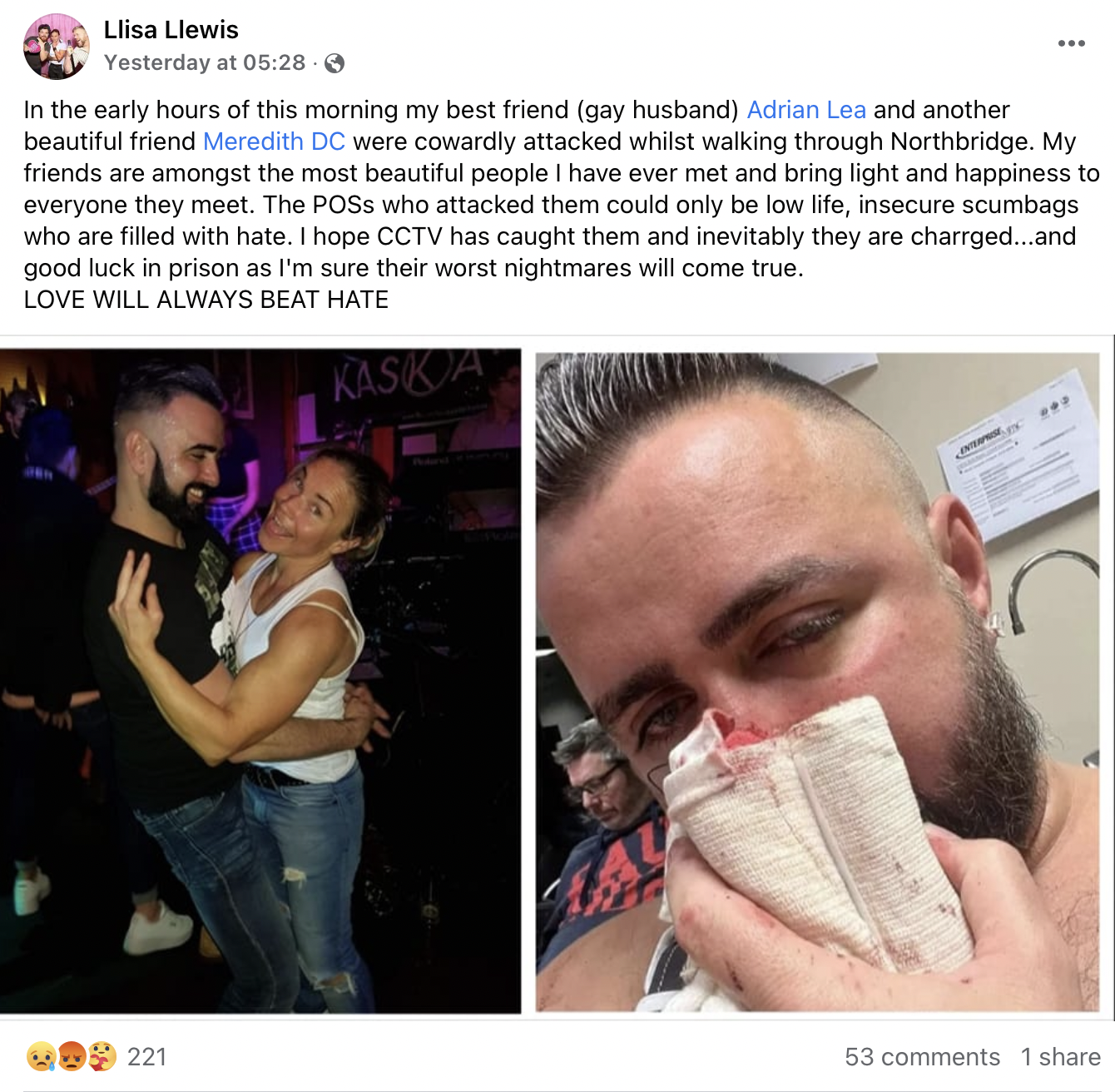 A friend of the pair, Llisa Llewis, posted about the incident on Facebook, writing that her “gay husband” Lea and “another beautiful friend” were “cowardly attacked whil[e] walking through Northbridge”.