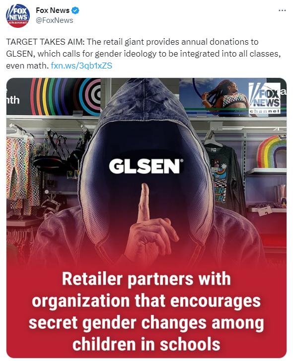 The tweet in question posted by Fox News reads: “Target takes aim: The retail giant provides annual donations to GLSEN, which calls for gender ideology to be integrated in all classes, even math.”