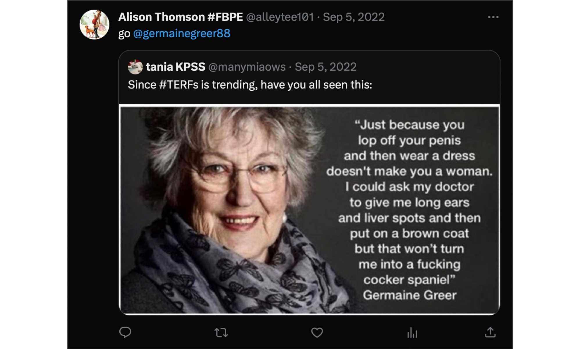 An archive of the posts , curated by an anonymous source, shows Thomson had liked a post which included the hashtag #transwomenareMEN and an offensive quote attributed to feminist Germaine Greer.