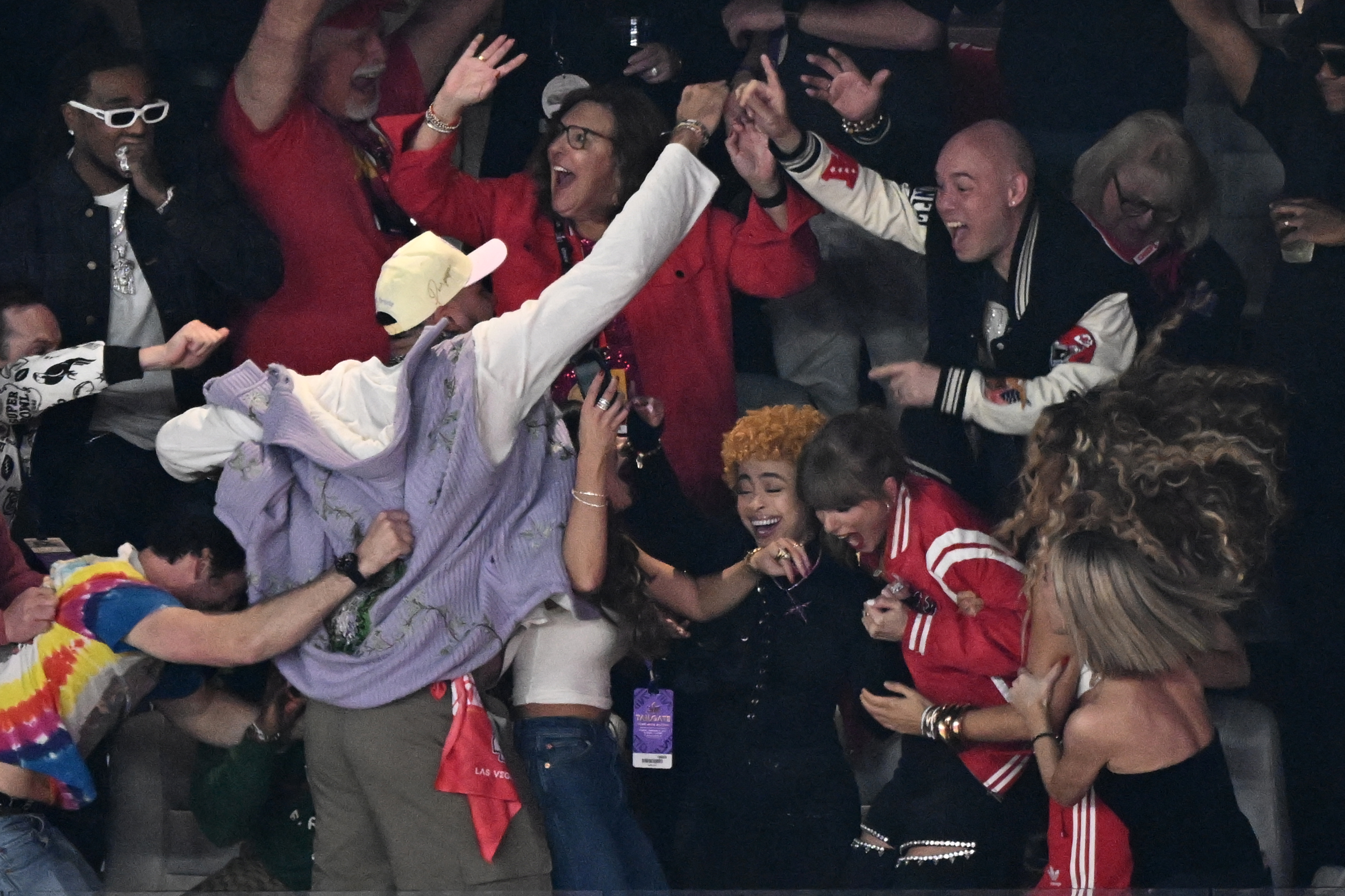 Swift cheered on the team’s massive win from the suite at Las Vegas’ Allegiant Stadium with her girl squad . She jumped for joy when the Chiefs were revealed as the winners alongside rapper Ice Spice and actor Blake Lively.