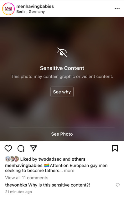 "Graphic content overlays are a valuable tool to mitigate extreme content — That shouldn’t include something as innocuous as a photo of two fathers with their newborn.